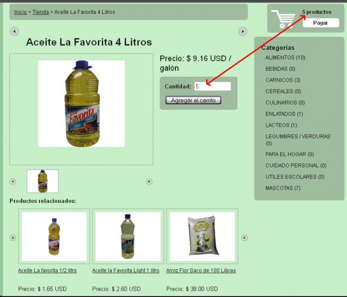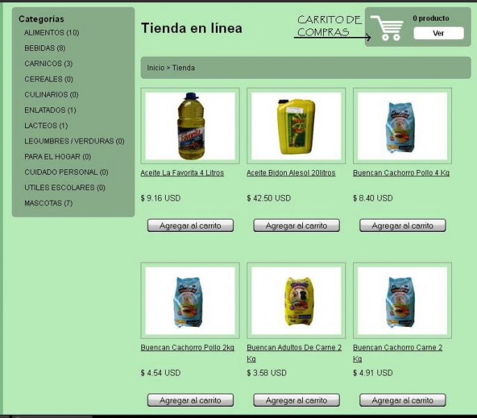 1.- Escoger los productos que se deseen. 1.1.- Lo puede hacer desde el menú CATEGORIAS ubicado a la izquierda del panel de la tienda en línea, al ubicarla se mostrarán todos los productos pertenecientes a determinada categoría, con la información gráfica, la descripción y el precio.
