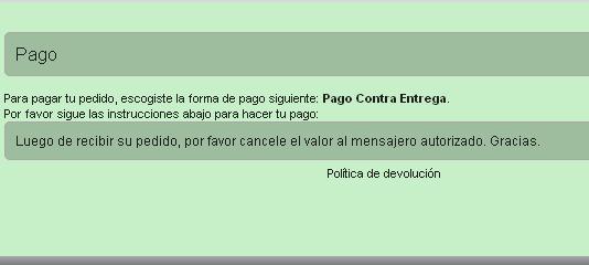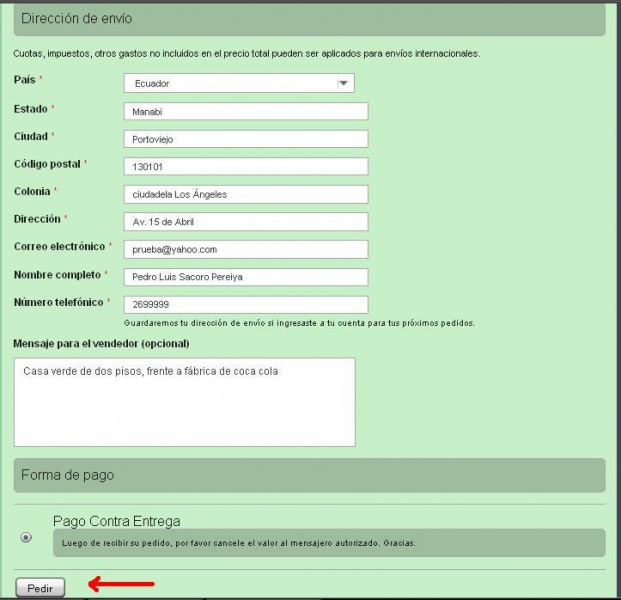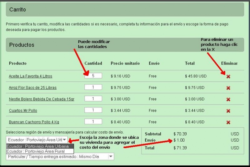 Para poner un producto en su "Carrito de Compras" simplemente haga clic en el botón AGREGAR AL CARRITO 1.2.- Haciendo clic en la imágen del producto, se mostrará un ampliación de la misma y un cuadro de texto que nos permite escribir la cantidad que deseamos, luego hacemos clic en el botón AGREGAR AL CARRITO: 2.- Editar su pedido en el Carrito de Compras. Para hacer la edición, haga clic en el botón PAGAR ubicado junto a la imágen del carrito, una vez dentro podemos aumentar/disminuir las cantidades de cada uno de los productos seleccionados, eliminarlos del carrito y escoger el área donde se ubica su vivienda (Urbana o Rural) para agregar el costo del envío, $2,00 área urbana o $3,00 para el área rural. En la parte inferior del panel, se muestra el formulario para informarnos la dirección de envío. En el cuadro mensaje para el vendedor usted puede dar detalles exactos de la ubicación de su vivienda, bloque, número de piso o instrucciones sobre horario para entregar su pedido, etc. Luego escogemos la forma de pago y hacemos clic en el botón PEDIR. Si ingresó como usuario de la Red de Tiendas, estos datos seràn almacenados para compras posteriores. Seguidamente el sistema te mostrará el siguiente mensaje: